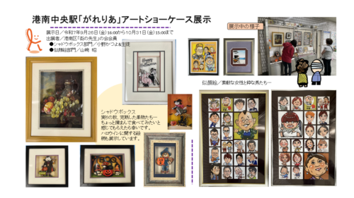 港南区「街の先生」の会会員/シャドウボックス部門の小野かつよ先生と、似顔絵部門の山﨑昭先生が、横浜市営地下鉄港南中央駅改札前の展示場「がれりあアートショーケース」に、作品を掲出しています。お近くに来られた際は是非ご覧ください。