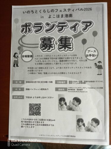 イベント情報 2026年03月27日 港南区ボランティア連絡会 ボランティア募集 2026年5月17日(日)10時〜15時。 いのちのくらしのフェスティバル2026 in よこはま港南 イベントでの会場整理やブースお手伝いのボランティアを募集しています。QRコードでも応募できます。 Tweet