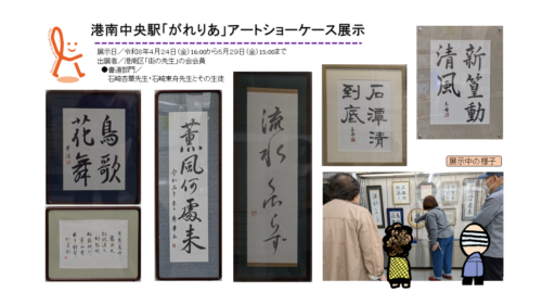 港南区「街の先生」の会会員/書道部門の石崎杏華先生・石崎東舟先生とその生徒さんが、横浜市営地下鉄港南中央駅改札前の展示場「がれりあアートショーケース」に、作品を掲出しています。お近くに来られた際は是非ご覧ください。
